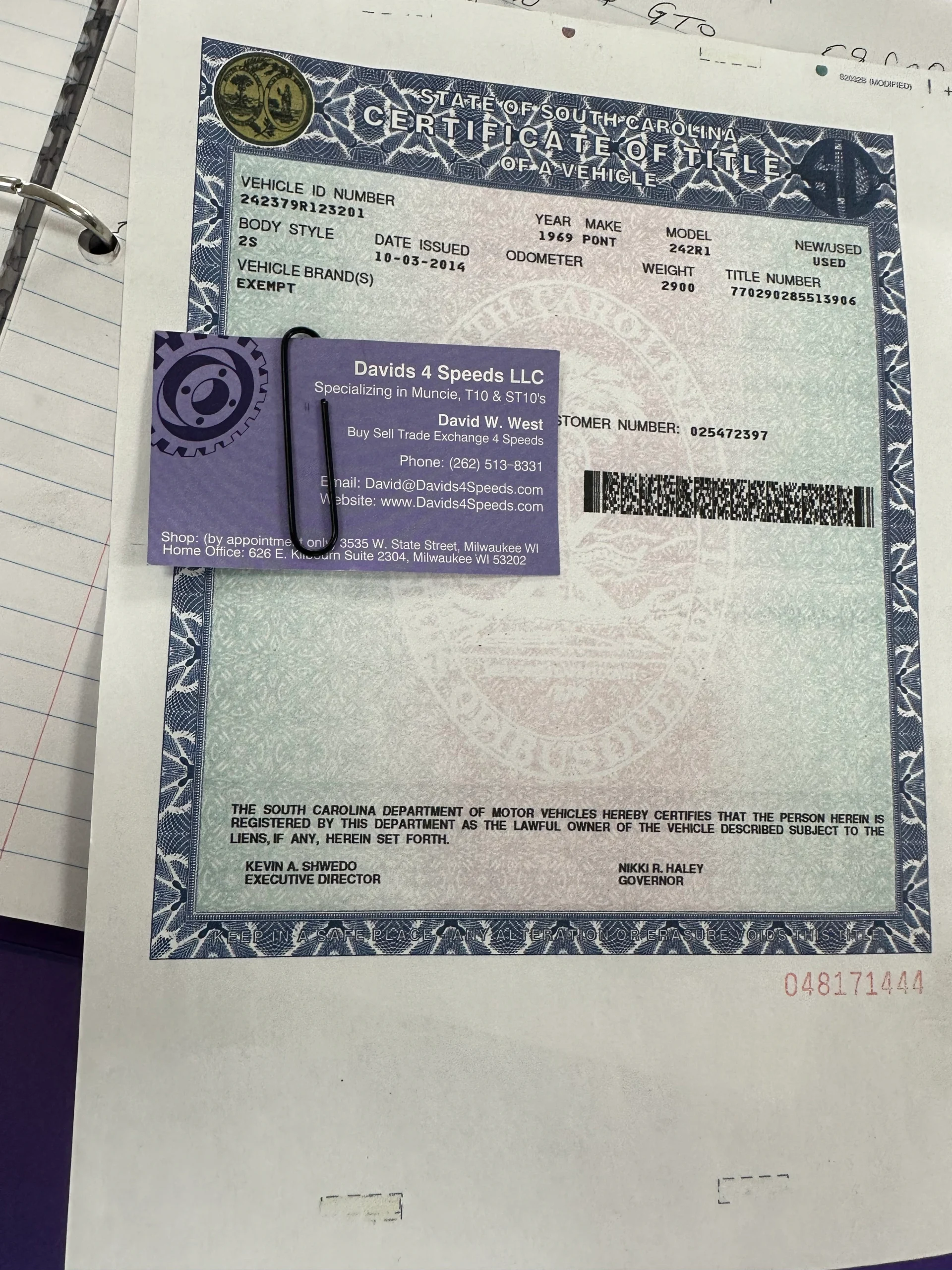 Please Contact Renard at (724)-549-6529: 400 Engine w/ 4-Speed Manual. 12 Bolt Posi Rear End. Power Steering Power Brakes. Front Disk Brakes. Stock Steel Wheels. BF Goodrich Radial. Tires 235/60/r15 Front. 245/60/r15 Rear Tires. Air Conditioning. AM Factory Radio. Although every reasonable effort has been made to ensure the accuracy of the information contained on this site, absolute accuracy cannot be guaranteed. This site and all information and materials appearing on it including price, are presented to the user "as is" without warranty of any kind, either express or implied. All vehicles are subject to prior sale. Price does not include applicable tax, title, license, processing and/or documentation fees. Vehicles shown at different locations are not currently in our inventory but can be made available to you.